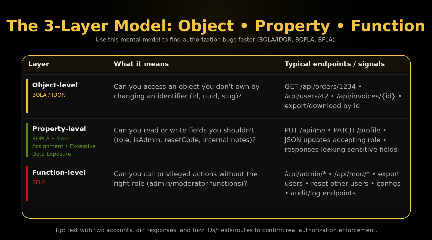 When you’re testing an API, it helps to think in three layers. Almost every authorization bug fits into one of these: