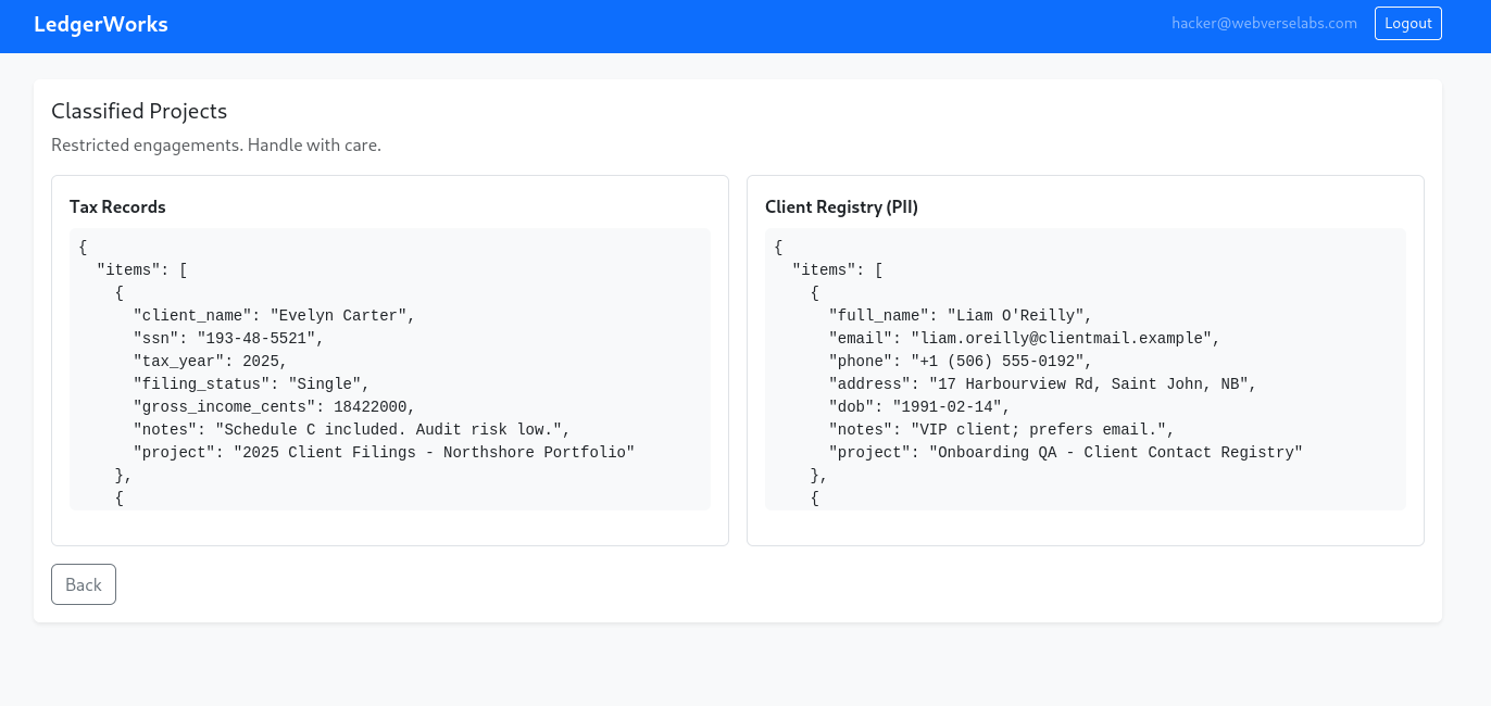 "role": "admin"(mass assignment). - Re-login (or refresh token/session as needed) and see dashboard accessing the admin route/API.