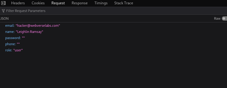Instead of whitelisting allowed fields (name, maybe avatar, etc.), the server accepts a JSON blob and updates account fields too freely — including role.