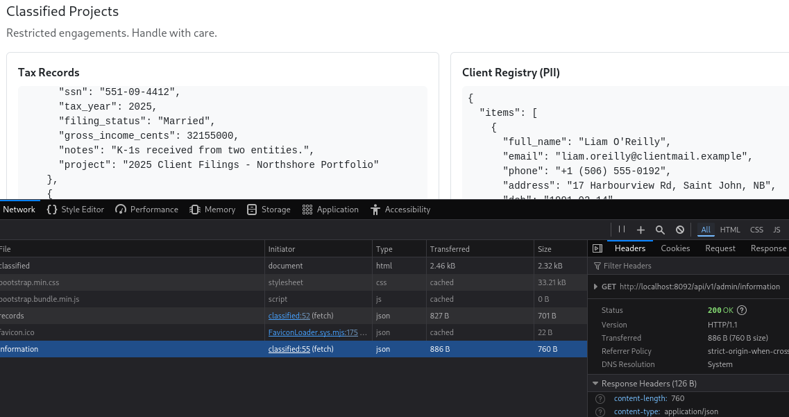 Pop open your browser dev tools (F12) and head to the Network tab. Refresh the page and watch what it loads. Among the usual static assets, you’ll spot the important part: the frontend is making calls to an admin API endpoint to fetch the classified data.