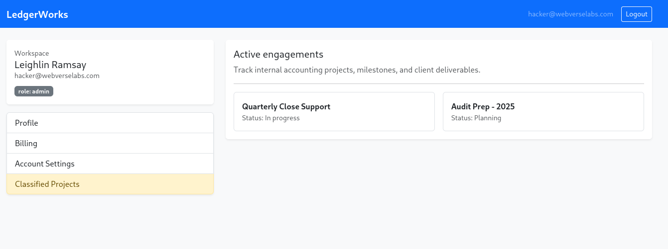 role escalation → Classified Projects access → Network tab reveals admin API → fuzz /api/v1/admin/* → find /config → flag.