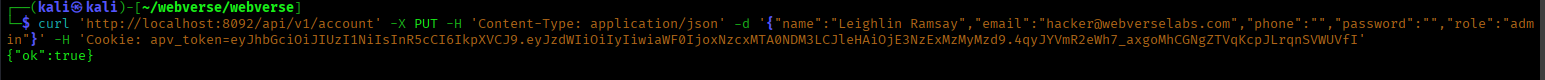 curl 'http://localhost:8092/api/v1/account' -X PUT -H 'Content-Type: application/json' -d '{"name":"Leighlin Ramsay","email":"[email protected]","phone":"","password":"","role":"admin"}' -H 'Cookie: apv_token={JWT_TOKEN}'