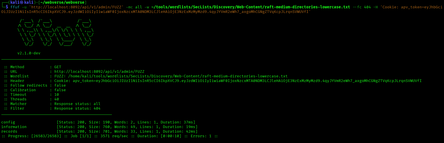 ffuf -u 'http://localhost:8092/api/v1/admin/FUZZ' -mc all -w ~/tools/wordlists/SecLists/Discovery/Web-Content/raft-medium-directories-lowercase.txt --fc 404 -H 'Cookie: apv_token={JWT_TOKEN}'